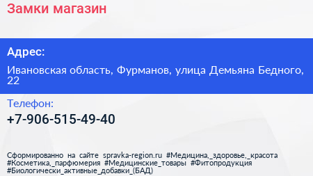 Замки, магазин по адресу Ивановская область, Фурманов, улица Демьяна Бедного, 22 в дальнейшем Организация, размещена в следующих категориях: