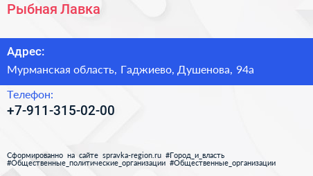 Рыбная Лавка по адресу Мурманская область, Гаджиево, Душенова, 94а в дальнейшем Организация, размещена в следующих категориях: