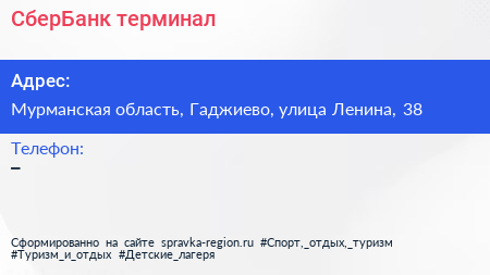 СберБанк, терминал по адресу Мурманская область, Гаджиево, улица Ленина, 38 в дальнейшем Организация, размещена в следующих категориях: