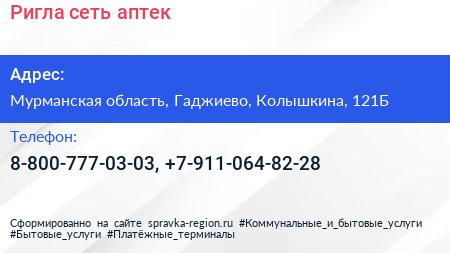 Ригла, сеть аптек по адресу Мурманская область, Гаджиево, Колышкина, 121Б в дальнейшем Организация, размещена в следующих категориях: