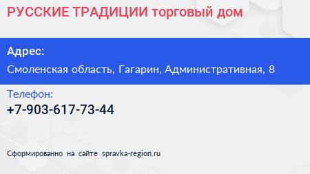 РУССКИЕ ТРАДИЦИИ, торговый дом по адресу Смоленская область, Гагарин, Административная, 8 в дальнейшем Организация, размещена в следующих категориях: