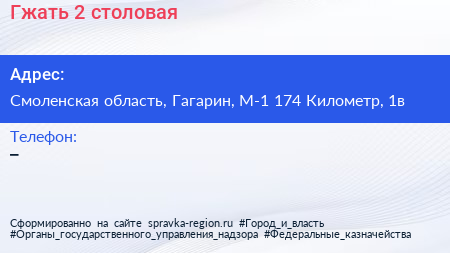 Гжать 2, столовая по адресу Смоленская область, Гагарин, М-1 174 Километр, 1в в дальнейшем Организация, размещена в следующих категориях: