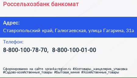 Россельхозбанк, банкомат по адресу Ставропольский край, Галюгаевская, улица Гагарина, 31а в дальнейшем Организация, размещена в следующих категориях: