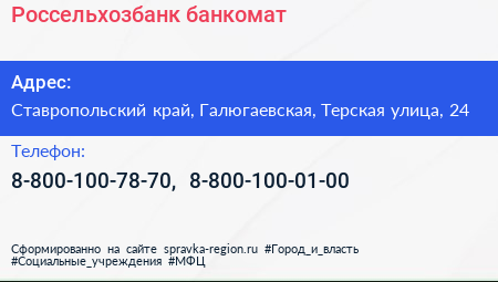 Россельхозбанк, банкомат по адресу Ставропольский край, Галюгаевская, Терская улица, 24 в дальнейшем Организация, размещена в следующих категориях: