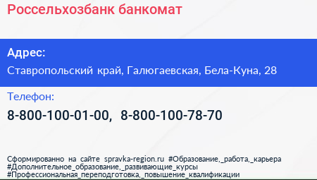 Россельхозбанк, банкомат по адресу Ставропольский край, Галюгаевская, Бела-Куна, 28 в дальнейшем Организация, размещена в следующих категориях: