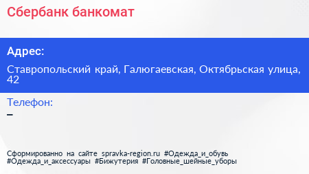 Сбербанк, банкомат по адресу Ставропольский край, Галюгаевская, Октябрьская улица, 42 в дальнейшем Организация, размещена в следующих категориях: