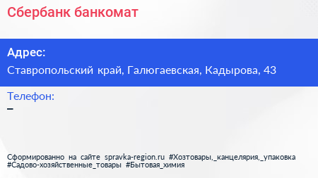 Сбербанк, банкомат по адресу Ставропольский край, Галюгаевская, Кадырова, 43 в дальнейшем Организация, размещена в следующих категориях: