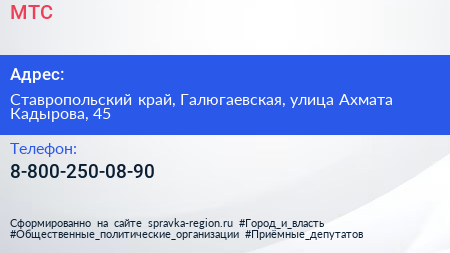 МТС по адресу Ставропольский край, Галюгаевская, улица Ахмата Кадырова, 45 в дальнейшем Организация, размещена в следующих категориях: