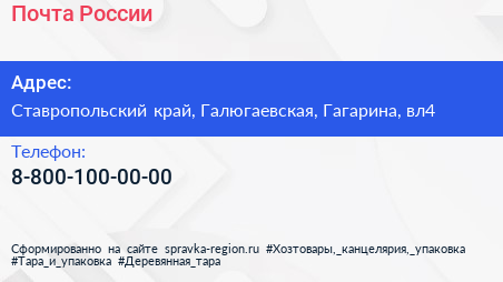 Почта России по адресу Ставропольский край, Галюгаевская, Гагарина, вл4 в дальнейшем Организация, размещена в следующих категориях: