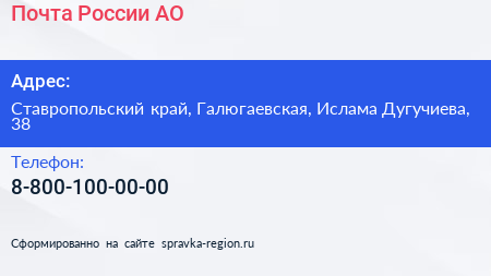 Почта России, АО по адресу Ставропольский край, Галюгаевская, Ислама Дугучиева, 38 в дальнейшем Организация, размещена в следующих категориях: