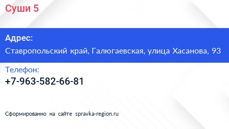 Суши 5 по адресу Ставропольский край, Галюгаевская, улица Хасанова, 93 в дальнейшем Организация, размещена в следующих категориях: