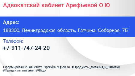 Адвокатский кабинет Арефьевой О.Ю. по адресу 188300, Ленинградская область, Гатчина, Соборная, 7Б в дальнейшем Организация, размещена в следующих категориях: