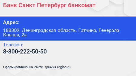 Банк Санкт-Петербург, банкомат по адресу 188309, Ленинградская область, Гатчина, Генерала Кныша, 2а в дальнейшем Организация, размещена в следующих категориях: