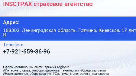 INSCТРАХ, страховое агентство по адресу 188302, Ленинградская область, Гатчина, Киевская, 17 лит В в дальнейшем Организация, размещена в следующих категориях: