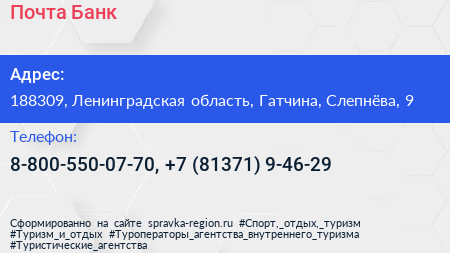 Почта Банк по адресу 188309, Ленинградская область, Гатчина, Слепнёва, 9 в дальнейшем Организация, размещена в следующих категориях:
