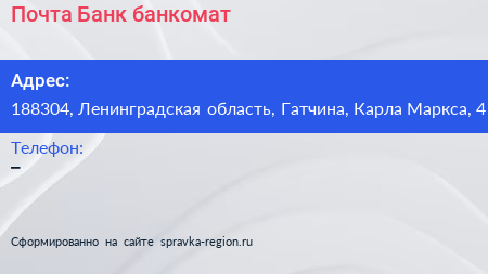 Почта Банк, банкомат по адресу 188304, Ленинградская область, Гатчина, Карла Маркса, 4 в дальнейшем Организация, размещена в следующих категориях: