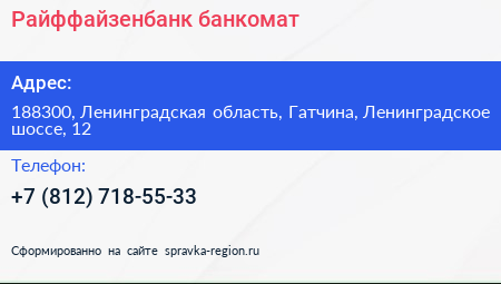 Райффайзенбанк, банкомат по адресу 188300, Ленинградская область, Гатчина, Ленинградское шоссе, 12 в дальнейшем Организация, размещена в следующих категориях: