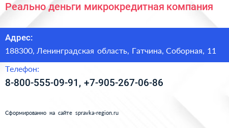 Реально деньги, микрокредитная компания по адресу 188300, Ленинградская область, Гатчина, Соборная, 11 в дальнейшем Организация, размещена в следующих категориях: