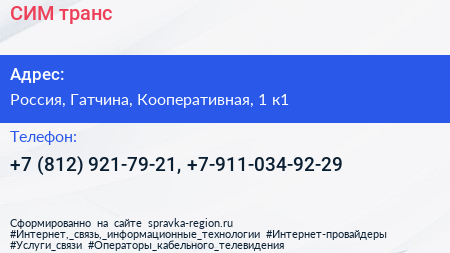 СИМ транс по адресу Сим транс, 1 к1, Кооперативная улица, Малые Колпаны, Гатчинский муниципальный округ, Ленинградская область, Северо-Западный федеральный округ, 188300, Россия в дальнейшем Организация, размещена в следующих категориях: