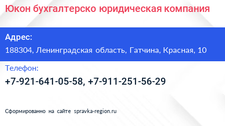 Юкон, бухгалтерско-юридическая компания по адресу 188304, Ленинградская область, Гатчина, Красная, 10 в дальнейшем Организация, размещена в следующих категориях: