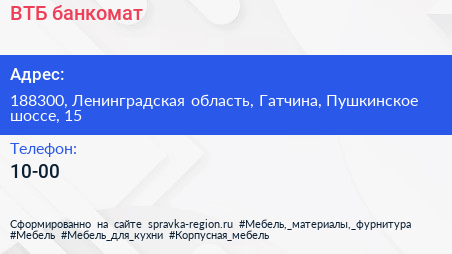 ВТБ, банкомат по адресу 188300, Ленинградская область, Гатчина, Пушкинское шоссе, 15 в дальнейшем Организация, размещена в следующих категориях:
