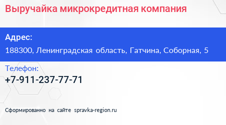 Выручайка, микрокредитная компания по адресу 188300, Ленинградская область, Гатчина, Соборная, 5 в дальнейшем Организация, размещена в следующих категориях: