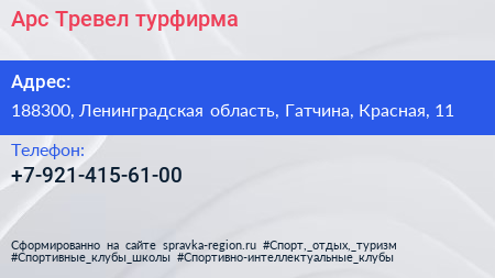 Арс Тревел, турфирма по адресу 188300, Ленинградская область, Гатчина, Красная, 11 в дальнейшем Организация, размещена в следующих категориях: