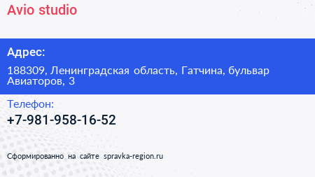 Avio studio по адресу 188309, Ленинградская область, Гатчина, бульвар Авиаторов, 3 в дальнейшем Организация, размещена в следующих категориях:
