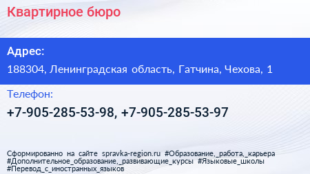 Квартирное бюро по адресу 188304, Ленинградская область, Гатчина, Чехова, 1 в дальнейшем Организация, размещена в следующих категориях: