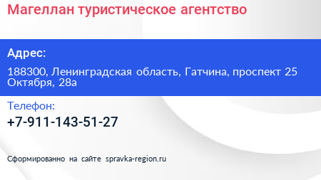 Магеллан, туристическое агентство по адресу 188300, Ленинградская область, Гатчина, проспект 25 Октября, 28а в дальнейшем Организация, размещена в следующих категориях: