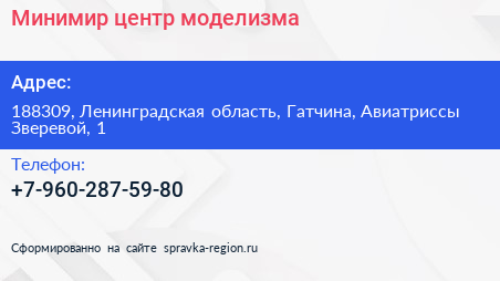 Минимир, центр моделизма по адресу 188309, Ленинградская область, Гатчина, Авиатриссы Зверевой, 1 в дальнейшем Организация, размещена в следующих категориях: