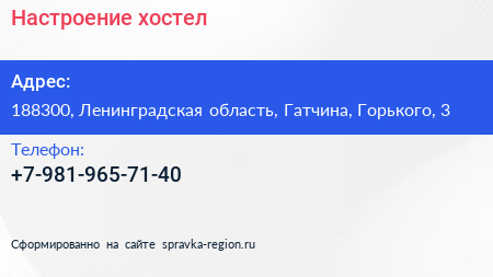 Настроение, хостел по адресу 188300, Ленинградская область, Гатчина, Горького, 3 в дальнейшем Организация, размещена в следующих категориях: