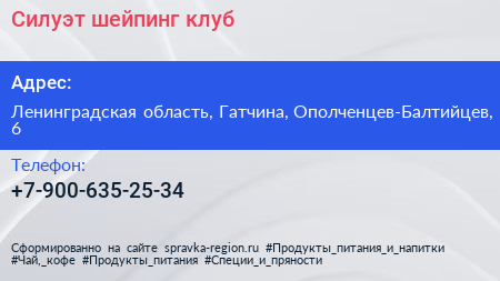 Силуэт, шейпинг- клуб по адресу Ленинградская область, Гатчина, Ополченцев-Балтийцев, 6 в дальнейшем Организация, размещена в следующих категориях: