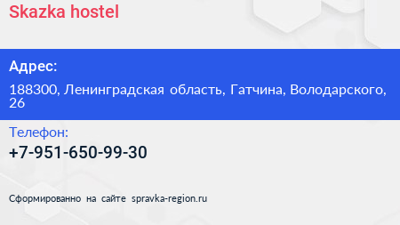 Skazka hostel по адресу 188300, Ленинградская область, Гатчина, Володарского, 26 в дальнейшем Организация, размещена в следующих категориях: