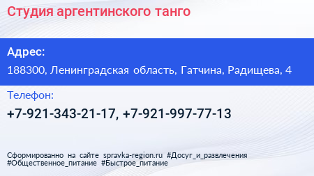 Студия аргентинского танго по адресу 188300, Ленинградская область, Гатчина, Радищева, 4 в дальнейшем Организация, размещена в следующих категориях: