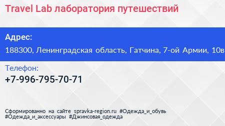 Travel Lab, лаборатория путешествий по адресу 188300, Ленинградская область, Гатчина, 7-ой Армии, 10в в дальнейшем Организация, размещена в следующих категориях: