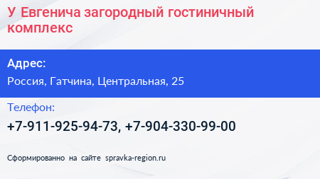 У Евгенича, загородный гостиничный комплекс по адресу Мини-отель "У Евгенича", Центральная улица, Пригородный, Гатчинский муниципальный округ, Ленинградская область, Северо-Западный федеральный округ, 188305, Россия в дальнейшем Организация, размещена в следующих категориях: