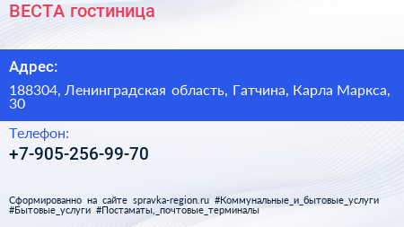 ВЕСТА, гостиница по адресу 188304, Ленинградская область, Гатчина, Карла Маркса, 30 в дальнейшем Организация, размещена в следующих категориях: