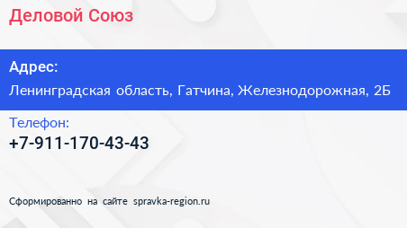 Деловой Союз по адресу Ленинградская область, Гатчина, Железнодорожная, 2Б в дальнейшем Организация, размещена в следующих категориях: