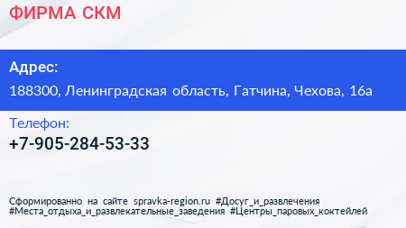 ФИРМА СКМ по адресу 188300, Ленинградская область, Гатчина, Чехова, 16а в дальнейшем Организация, размещена в следующих категориях: