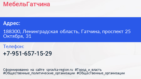 МебельГатчина по адресу 188300, Ленинградская область, Гатчина, проспект 25 Октября, 31 в дальнейшем Организация, размещена в следующих категориях:
