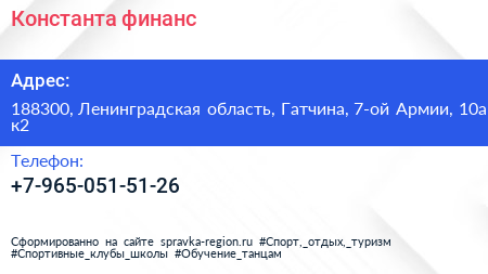 Константа-финанс по адресу 188300, Ленинградская область, Гатчина, 7-ой Армии, 10а к2 в дальнейшем Организация, размещена в следующих категориях: