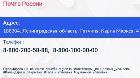 Почта России по адресу 188304, Ленинградская область, Гатчина, Карла Маркса, 4 в дальнейшем Организация, размещена в следующих категориях: