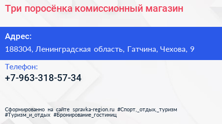 Три поросёнка, комиссионный магазин по адресу 188304, Ленинградская область, Гатчина, Чехова, 9 в дальнейшем Организация, размещена в следующих категориях: