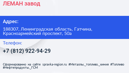 ЛЕМАН, завод по адресу 188307, Ленинградская область, Гатчина, Красноармейский проспект, 50а в дальнейшем Организация, размещена в следующих категориях: