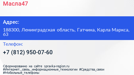 Масла47 по адресу 188300, Ленинградская область, Гатчина, Карла Маркса, 63 в дальнейшем Организация, размещена в следующих категориях: