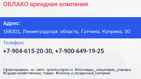 ОБЛАКО, арендная компания по адресу 188301, Ленинградская область, Гатчина, Куприна, 10 в дальнейшем Организация, размещена в следующих категориях: