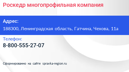 Роскедр, многопрофильная компания по адресу 188300, Ленинградская область, Гатчина, Чехова, 11а в дальнейшем Организация, размещена в следующих категориях:
