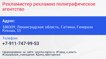 Рекламистер, рекламно-полиграфическое агентство по адресу 188309, Ленинградская область, Гатчина, Генерала Кныша, 15 в дальнейшем Организация, размещена в следующих категориях: