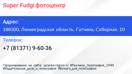 Super Fudgi, фотоцентр по адресу 188300, Ленинградская область, Гатчина, Соборная, 10 в дальнейшем Организация, размещена в следующих категориях:
